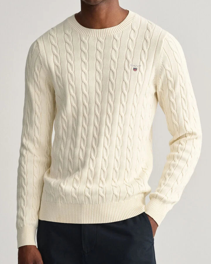 GANT Cotton Cable C-Neck kabelstickad tröja. En tidlös kabelstickad tröja från GANT som är en preppy klassiker. Denna klassiska modell med normal passform och rund halsringning kombinerar komfort med GANTs karakteristiska preppy stil. Ribbstickade muddar och broderad logotyp på bröstet ger en stilren finish.