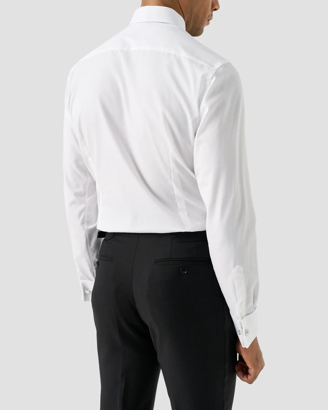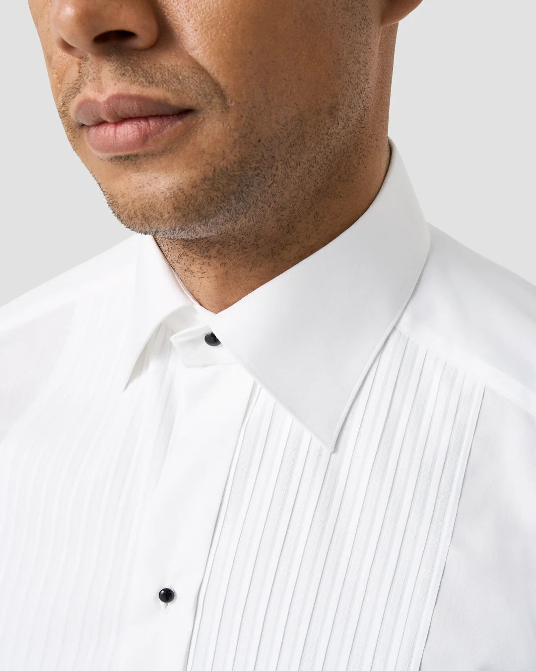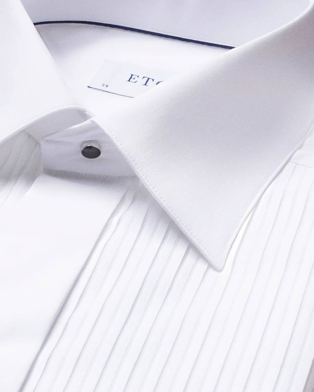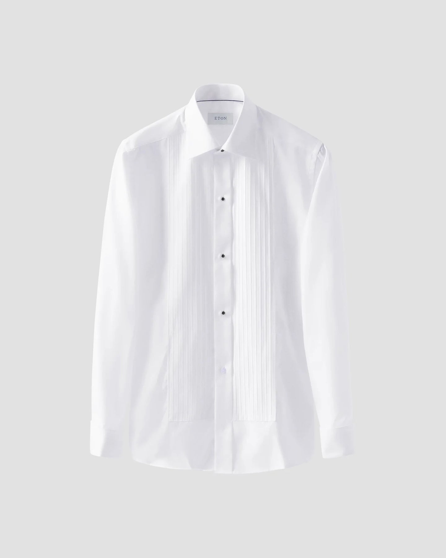 Eton Smoking­skjorta är en elegant och exklusiv festskjorta för herr, designad för smokingtillställningar där varje detalj räknas. Det plisserade skjortbröstet ger ett sofistikerat, tidlöst uttryck och lyfter din festlook till nästa nivå. Tillverkad i extra långfibrig ELS-bomull som ger en mjuk, hållbar och skrynkeltålig kvalitet. Skjortan har en moderate cut away-krage, dubbel manschett (French cuffs) och levereras med svarta avtagbara knappar för en fulländad smokingstil. Den smala passformen ger en skarp, modern siluett perfekt för bröllop, galor och formella kvällar.