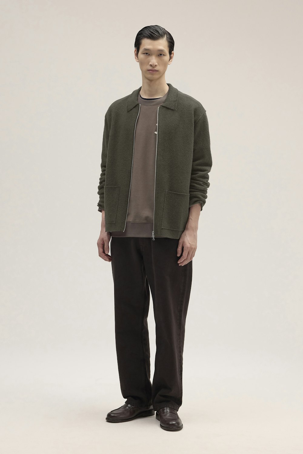 Hybridjacka tillverkad av kokad merinoull med fluffig, texturerad känsla. Designad med råkantade detaljer i kokad ull och helknäppning med dragkedja med logomärke.