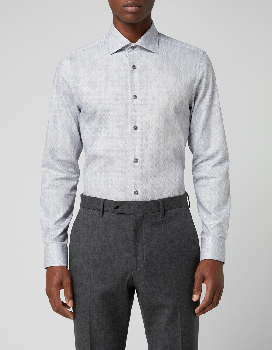 Brokadskjortan – lite kraftigare, lite tyngre. Den här skjortan har en framträdande textur och en väl avvägd lyster. Med knappar som går ton i ton.