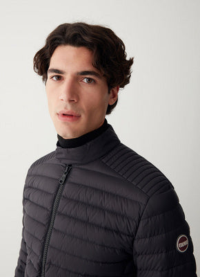 Herrhöstjacka från Colmar - bikermodell tillverkad av superlätt och återvunnet ogenomskinligt tyg. Vadderad med lätt, naturligt dun. Den vanliga quiltningen på kroppen ökar tätheten på axlarna, vilket skapar en geometri som ger rörelse åt denna ikoniska modell. Komplettera din avslappnade look eller mjuka upp en mer elegant outfit med denna praktiska och bekväma 100-grams dunjacka.
