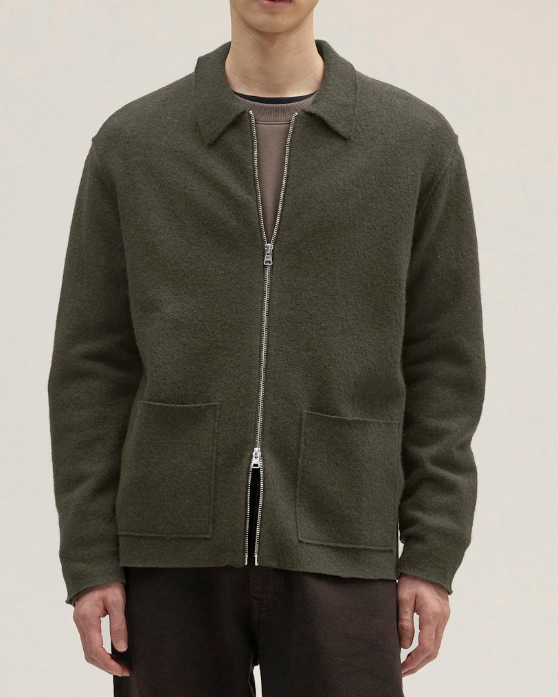 Hybridjacka tillverkad av kokad merinoull med fluffig, texturerad känsla. Designad med råkantade detaljer i kokad ull och helknäppning med dragkedja med logomärke.